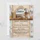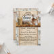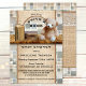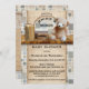 A cute and original baby shower invitation featuring a shelf with books and teddy bear on a burlap and tile design background.