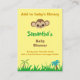 Request books from your baby shower guests on a cute safari themed design. The top has "Add to baby's library" written in lovely golden font. There is a monkey underneath with the guest of honour's name centred in green. "Baby shower" written underneath in brown, with a message to bring books underneath. Place your order today!