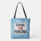 "Bring The Popcorn" is a cute text design in light blue with black and red text, along with a white accent shape and white textured whimsical dots surrounding it.