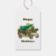 This adorable design features a vintage car decorated with holly and berries. In the car there is a fresh Christmas tree with a SOLD tag. The text reads Happy Holidays. On the back of the tag, a smaller version of the car and an area for your custom text.