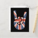 Cow says "moo," big rock salute hand with Union Jack says, "woo!" Colour, t-shirts, sweats, cards, gifts.