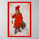 Bright Christmas dress and hat with furry shoes Brita carries candles and a basket of apples. Fine art by Swedish painter Carl Larsson.