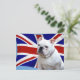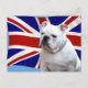 Shown is a photographic image of a white English bulldog in front of a British flag.