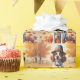 A watercolor-style painting of a cheerful dog sitting amidst a pile of vibrant fall leaves, surrounded by tiny pumpkins and scattered acorns. The dog wears a little pilgrim hat and beams with joy, capturing the spirit of Thanksgiving. In the background, soft harvest fields and golden-hued trees create a peaceful countryside ambiance. Gentle textures and warm, muted autumn tones give the scene a cosy, nostalgic feel perfect for celebrating the beauty of the season.