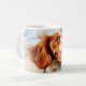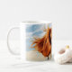 A orange and white Brittany spaniel with long, flowing fur is sticking its head out of a car window. The dog's tongue is hanging out, and its ears are flapping in the wind. The dog's fur is a mix of brown and white, and its eyes are brown. The background is a blue sky with white clouds. The image has a cheerful and playful mood, capturing the joy of a dog enjoying a car ride. Perfect gift for Brittany lovers.