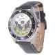 My husband loves the watch, he likes the dial, the graphics, the band, and it keeps perfect time.