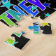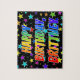 This lively, vibrant, birthday-themed jigsaw puzzle design has the message "HAPPY BIRTHDAY, BRITTNEY" with the characters having a colorful rainbow spectrum inspired gradient pattern, in addition to an exciting star shapes background pattern. A colorful puzzle like this might be used to send a birthday greeting message to somebody named Brittney. [~Z0000468]