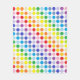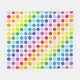 Abstract digital art of rainbow polka dots of all colours including pink, red, gold, orange, ecru, yellow, lime green, green, pastel blue, turquoise, blue grey, indigo, lavender, purple, and white.