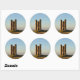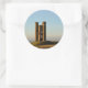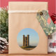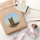 Round souvenir photo sticker with the folly Broadway Tower on a hill near Broadway overlooking the Cotswolds in England, UK at sunset.