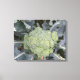 This awesome canvas print features a detailed photograph of a head of broccoli growing in a garden. The tightly bunched green florets are surrounded by the large outer leaves of the vegetable.