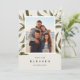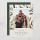 Elegant botanical holiday photo card sets your favorite family photo on a background of green and brown handpainted leaves. Personalize with your names or family name beneath a Christmas greeting ("merry and blessed") in elegant, classic lettering. Add three additional photos to the reverse side on a contrasting hunter green background, along with the year.