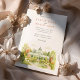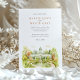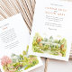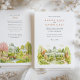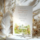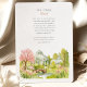 Invite your guests to a breathtaking celebration with this romantic watercolor wedding invitation, beautifully showcasing the iconic conservatory at the Brooklyn Botanic Garden. The artwork on the front captures the serene beauty of autumn, with the elegant glasshouse and its distinctive dome reflected in a tranquil pool. Surrounding trees display a warm palette of golden yellows and rusty oranges. The reverse side offers "The Finer Details" and continues the garden theme with a delightful spring or summer scene. It features the same stunning conservatory, now accompanied by a charming arched wooden bridge over a serene pond, a magnificent pink blossoming tree (reminiscent of cherry blossoms), and elegant tall pink and white flowers, possibly tulips or lilies, lining a garden path. Rendered in a soft, elegant watercolor style, this invitation is perfect for nature-loving couples, garden weddings, or those seeking a touch of classic New York charm. The blend of seasonal depictions adds a unique, year-round appeal. The colour palette includes soft greens, whites, creams, pale blues of the glass, vibrant pinks of the blossoms and tulips, and the warm golden yellows and oranges of autumn foliage.