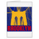 An up-close view of the Brooklyn Bridge standing in-between the wire cables. The cables form a man-made spider's web with the imposing stone tower of the bridge in the background. The word Brooklyn in block text is shown at the bottom with a solid colour background. Available in several colour variations.