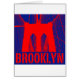An up-close view of the Brooklyn Bridge standing in-between the wire cables. The cables form a man-made spider's web with the imposing stone tower of the bridge in the background. The word Brooklyn in block text is shown at the bottom with a solid colour background. Available in several colour variations.