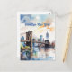 A vibrant watercolor painting of the iconic Brooklyn Bridge in New York City. The bridge is depicted in detail, with its intricate cables and towers clearly visible. The cityscape of Manhattan rises in the background, with several skyscrapers and landmarks identifiable. The water below the bridge is painted in shades of blue and green, reflecting the light of the setting sun.