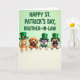 Designed with a festive touch, this digital illustration shows four young animals—an orange tabby kitten, a fluffy golden puppy, a gray-and-white dog, and a fawn-colored pug—peeking together over a bright white panel as if they’re leaning in like close friends. Each one wears an emerald green top hat with a small gold buckle, and the gray-and-white pup also sports a matching green bow tie for extra charm 💚. Their wide eyes and open-mouthed grins, with a couple of tongues sticking out, create the kind of affectionate, goofy closeness you’d share with someone you really like. Above their heads, the message “HAPPY ST. PATRICK’S DAY, BROTHER-IN-LAW” sits centered near the top in dark green, standing out clearly against a pale green gradient background ☘️. The letters are in a thick, easy-to-read style that feels celebratory without being fussy. Soft lighting highlights the kitten’s tabby markings, the fluffy fur of the golden pup, and the pug’s wrinkled muzzle while keeping the background gentle and uncluttered. A crisp white strip spans the lower portion of the image, with the animals’ paws and chins resting along its top edge.