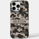 Customize this brown and gray camouflage iPhone 16 pro max case with your name in a trendy modern CAP font in brown on taupe. It's masculine and perfect for your favorite military, hunting, country or outdoorsman!