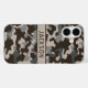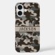 Customize this brown and gray camouflage iPhone 16 case with your name in a trendy modern CAP font in brown on taupe. It's masculine and perfect for your favorite military, hunting, country or outdoorsman!