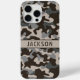 Customise this brown and grey camouflage iPhone 15 pro case with your name in a trendy modern CAP font in brown on taupe. It's masculine and perfect for your favourite military, hunting, country or outdoorsman!