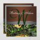 Brown and Mossy Green Camo Wedding Invitations - feature an outdoor hunting camo print in various, vibrant, green, brown, grey and other wilderness shades at the bottom of each invite. The top half is shaded in a vibrant deep brownish-bronze colouring that's divided from the bottom leaf & branch scheme with a dark silver metallic printed border. The invitation text on the front showcases overlapping text for bold, elegant lettering to display a large monogram for the groom's last initial. The back of each invite features the same design with a text box that allows graphics to peek through. The invitation stock is set to linen for added flair. You can change the stock to basic, felt, recycled, and several metallic shades if you would like under number 2 (choose your style, size & paper type) below the orange add to cart button. Each invitation comes with a white fitted envelope.