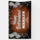 Fun banner sign for indoors or out, featuring festive silver metallic balloons on both sides of the design with sparkly, silver metallic confetti on a rich textured chocolate brown background for your personalised retirement party banner.