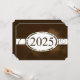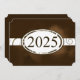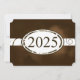 Floral designs surrounding button on top of a white ribbon that has floral designs. Brown cloudy background. The back of the card has a brown background with white lettering for the graduation announcements.