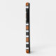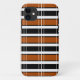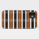 This phone case has a geometric design of a plaid with brown and white lines on a black background.