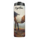 A pinto pony on a misty moor, in the style of George Stubbs, creates a thermal tumbler that's perfect for anyone who loves horses and ponies.