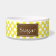 Cute and chic white polka dots pattern on a yellow background color. There is also a customizable text area for your pet's name on a brown background.