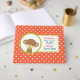 Baby shower guest book.  Designed with a cute baby monkey holding a pacifier in his mouth inside a circle with an olive green border. The background is an orange and white polka dot pattern.  The letters in the word baby are hanging down from a boho style arrow.