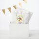 Baby shower favour bags. Designed with a cute baby monkey holding a pacifier in his mouth inside a circle with an olive green border. The letters in the word baby are hanging down from a boho style arrow. Text says thank you and is ready to be customised with your guest of honour's name.