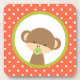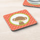 A coaster with a cute baby monkey holding a pacifier in his mouth inside a circle with an olive green border. The background is an orange and white polka dot pattern.
