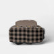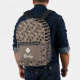 Brown backpack perfect for your dog's treats and toys and blankets with a brown and black pattern of bones and yellow balls and paw prints with stripes and a brown buffalo check, personalised with your dog's name beneath a paw print. Brown paw print backpack personalised with name in a white script with a mix of patterns like stripes, brown buffalo check, and bones and balls and paw prints.