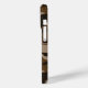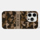 Customize this multi-hued brown camouflage iPhone 15 pro case with your name in a trendy modern CAP font in dark brown on light brown. It's masculine and perfect for your favorite military, hunting, country or outdoorsman!