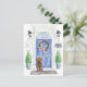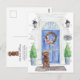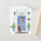 Announce your new address with our stylish announcement featuring a Brown Cockapoo, blue front door, welcome mat, slate sign, topiaries and a floral wreath set on a grey brick background.