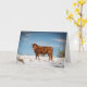Brown bull in a field covered with snow against a lovely blue sky greetings card