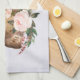 A kitchen towel with a cute design created with watercolors featuring a brown cowgirl hat with a bouquet of pink flowers on the brim.