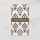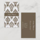 This elegant business card is perfect for any business or store. It features a white background with a brown damask pattern on the top and bottom of the front. A brown stripe runs through the centre. The back is a solid brown. All text is customisable.