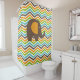 Shower curtain featuring a brown elephant with orange ears on a chevron stripe background of orange, brown, blue, green, and white.