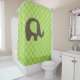 Shower curtain featuring a brown elephant with patterned green ears on a background of green polka dots.