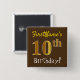 This simple square button design features a message like "FirstName’s 10th Birthday!", with the "10th" having a faux/imitation gold-like colouring look, on a brown coloured background. The name can be personalised. Buttons like these could perhaps be worn by guests at a birthday party for somebody who is celebrating their tenth birthday, where the party is being held in a large area with lots of other people present (such as a city park or a theme park). [~Z0000165]
