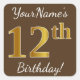 Brown, Faux Gold 12th Birthday + Custom Name Square Sticker