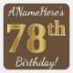 Brown, Faux Gold 78th Birthday + Custom Name Square Sticker