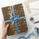 This wrapping paper design features a message like "HAPPY 4th BIRTHDAY", with the "4th" having a faux/imitation gold appearance. It also features a personalised name, and a brown coloured background. It could perhaps be used when wrapping gifts being given for somebody’s fourth birthday. [~Z0000133]