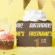 This wrapping paper design features a message like "FIRSTNAME’S 1st BIRTHDAY!", with the "1st" having a faux/imitation gold-like colour appearance, and with the name and "BIRTHDAY" in a fun, bold font. The name can be personalised, and the background is coloured brown. Wrapping paper like this could perhaps be used when wrapping birthday gifts being given to somebody in celebration of their first birthday. [~Z0000211]
