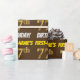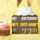 This wrapping paper design features a message like "FIRST-NAME’S 77th BIRTHDAY!", with the "77th" having a faux/imitation gold-like colour appearance, and with the name and "BIRTHDAY" in a fun, bold font. The name is customisable, and the background is coloured brown. Wrapping paper like this could perhaps be used when wrapping birthday gifts being given to somebody in celebration of their seventy seventh birthday. [~Z0000211]