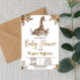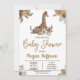 This is a brown giraffe safari animal themed baby shower invite. The design consists of brown leaves and gold foil.