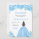 This Quinceanera invitation features faux glitter bright blue floral flowers and a beautiful princess with brown hair and an elegant dress. This is perfect for a Quinceanera birthday party.