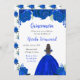This Quinceanera invitation features faux glitter royal blue floral flowers and a beautiful princess with brown hair and an elegant dress. This is perfect for a Quinceanera birthday party.
