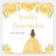This Quinceanera sticker features faux glitter gold floral flowers and a beautiful princess with brown hair and an elegant dress. This is perfect for a Quinceanera birthday party.